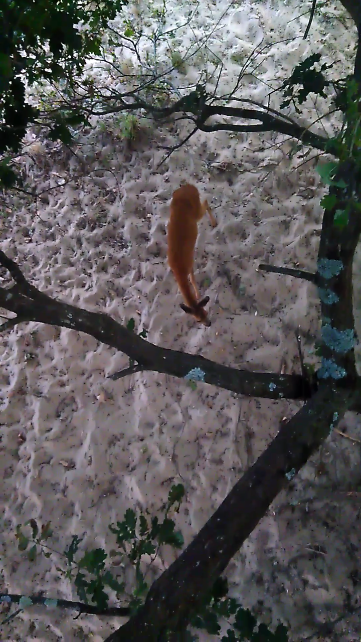 Ce soir je décide de m'installer dans un chêne, cela me limite en distance et en fenêtre de tir mais les glands commencent à tomber et connaissant la gourmandise des chevreuils, il est fort possible que j'aie une opportunité ! 19h en place, 19h30 un "crac" derrière moi ! Eh voilà, une jeune chevrette est en train de déguster des glands. C'est la troisième occasion de tir sur chevrette cette année, je décide donc de faire un film pour faire profiter les amis. Elle est restée là, sous moi à moins de trois mètres pendant plus de 10 minutes et pendant tout ce temps j'espérais qu'un éventuel brocard vienne la rejoindre mais non ! Tout à coup, elle se fixe, regarde dans une direction et là une odeur forte et acide me remplit le nez. La chevrette part, je range vite le téléphone.
